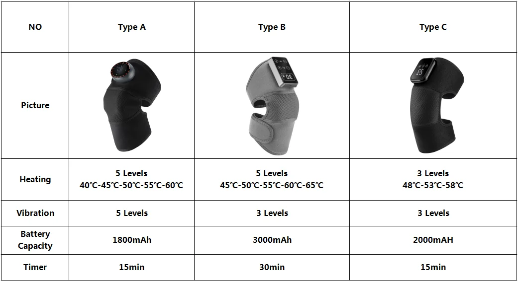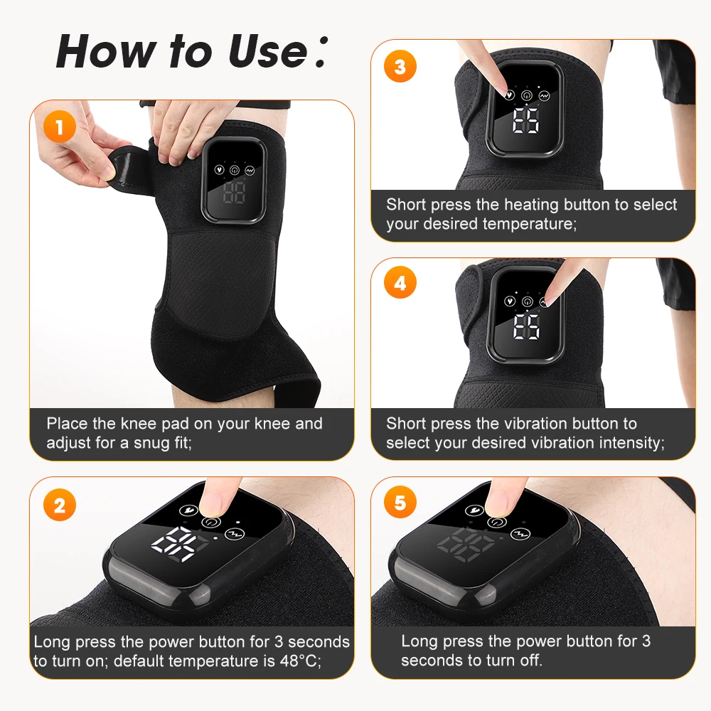 1. The electric knee massager features 5 infrared heat settings (45°C, 50°C, 55°C, 60°C, 65°C) for effective pain relief, especially for joint pain and arthritis, ensuring optimal comfort and therapeutic results.